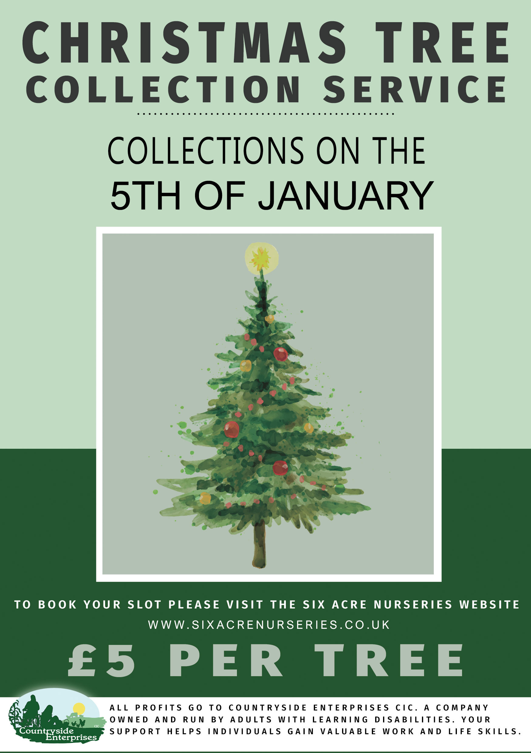 Take the stress and hassle away from disposing of your old Christmas tree while also knowing it will be used in Community interest projects to enhance the local natural environment. All profits also go directly to Countryside Enterprises – a community Interest company owned and operated by adults with learning disabilities.